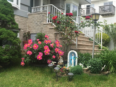picture of that same front, now with some zinnias (I think) in front of the Madonna.You can start seeing the yellow day lilies in